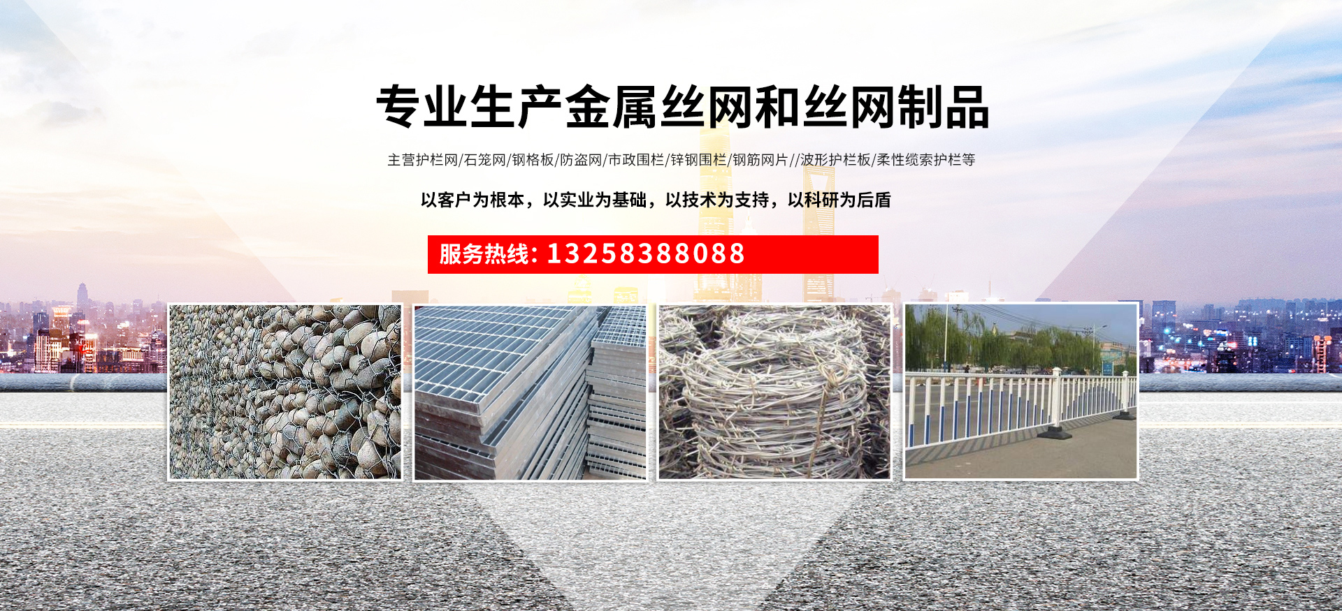 成都宏旭金屬絲網制造有限公司主營護欄網系列、石籠網系列、鋼格板、防盜網、市政圍欄、鋅鋼圍欄、鋼筋網片、聲屏障系列、波形護欄板、柔性纜索護欄、SNS邊坡防護網等其他絲網類產品。特殊規(guī)格可加工定做,也可根據客戶來圖來樣定做。自創業以來,公司一直堅持市場為導向,以客戶為根本,以實業為基礎,以技術為支持,以科研為后盾,集科研、生產、經營為一體,不斷研制開發(fā)新產品,開拓市場,走綜合發(fā)展之路。多年來,公司憑借過硬的質量,良好的信譽、優(yōu)質的服務、合理的價格,贏得了市場和商家的一致好評。